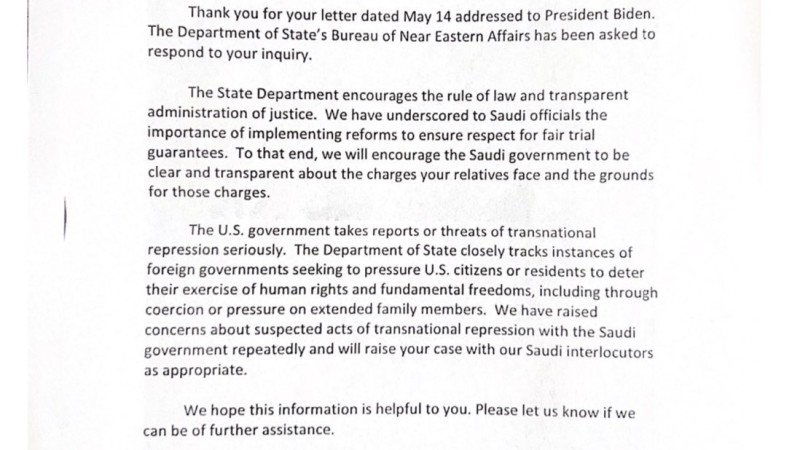 جاء ذلك في رد وزارة الخارجية الأميركية في 11 يوليو/تموز 2023، بلسان نائب الأمين المساعد لشؤون الشرق الأدنى دانيال بنعيم، على الرسالة التي وجهها الدوسري في 14 مايو/أيار 2023، إلى الرئيس الأميركي جو بايدن، يطالبه فيها بالتدخل في القضية، مؤكدة أن حكومة الولايات المتحدة تأخذ تقارير أو تهديدات القمع العابر للحدود على محمل الجد.